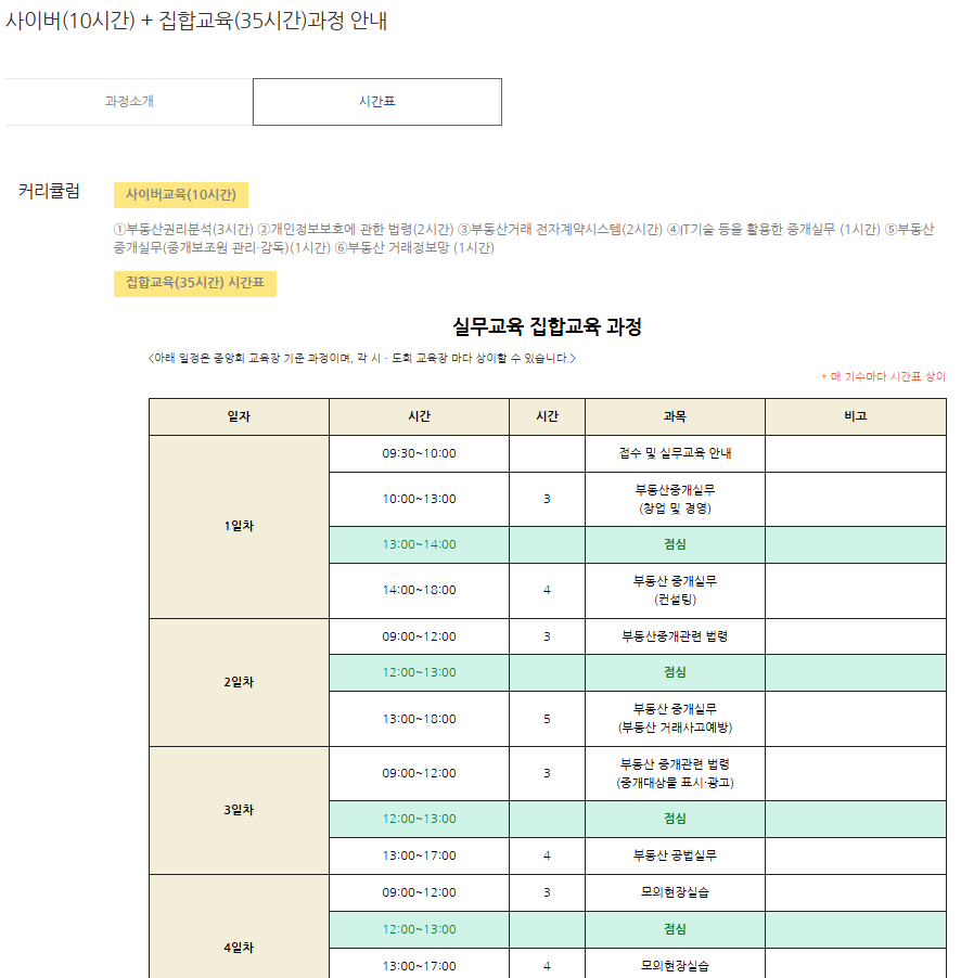 수강신청하신 집합교육장의 수강시간 및 장소와 약도 준비물 등은 개강 2~3일 전 각 시도회에서 문자로 안내드리고 있으며, [나의강의실] ▶ 학습종료 과정의 집합교육 하단의 [예약변경 및 예약확인] 클릭 시에도 확인 가능합니다. ![]() ![]() [실무교육] 메뉴 클릭 후 스크롤하여 하단 [시간표] 탭 선택하시면 중앙회 기준 커리큘럼 및 수강시간 확인이 가능하오니 이 점 참고 부탁드립니다. |